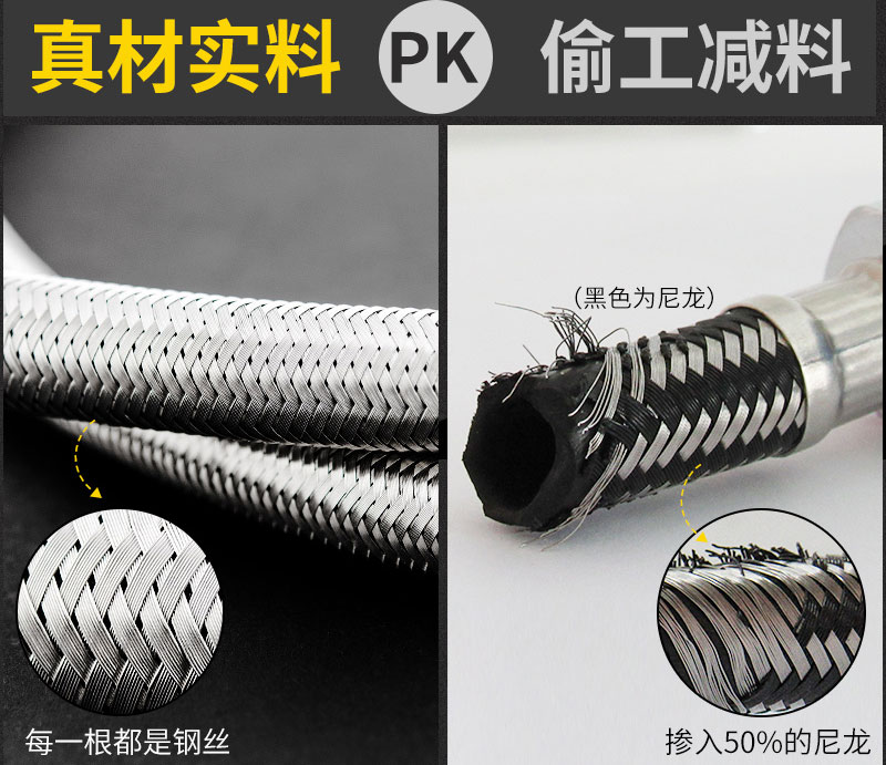 實驗證明:金屬軟管采用201不銹鋼,具有不走絲,燒不著等優點,將不銹鋼和尼龍混在一起,品質經不起火煉。 |